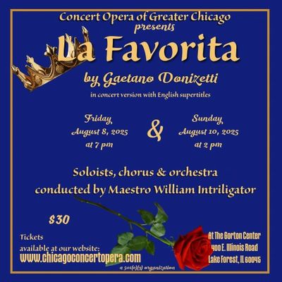 Concert Opera of Greater Chicago presents G. Donizetti's masterpiece, La Favorita. Opera in four acts to be performed in concert version with English supertitles.
